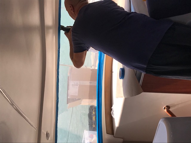 - Salonfenster Backbordseite, ausgebaut, eingebaut und verfugt (Sika, Primer)